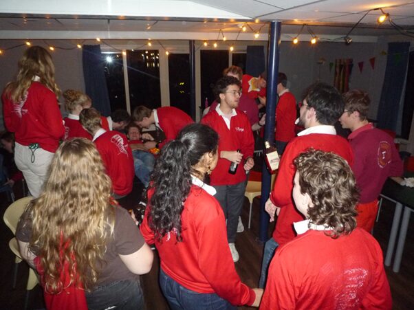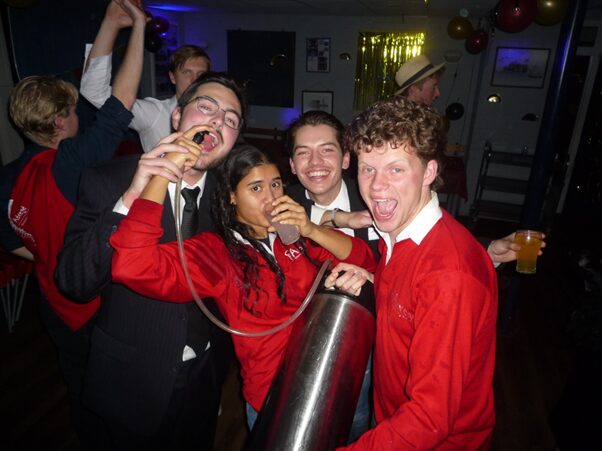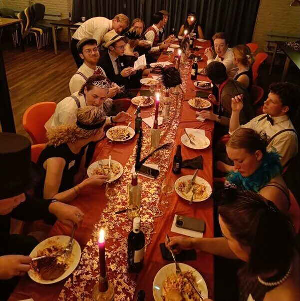 Terug in Giethoorn stond al het volgende activiteit voor ons klaar. Tijdens het eten speelde wij een Murder-Mystery spel, waar iedereen zich in het lichaam van de personages dook. Verkleed in de juiste kleren ging iedereen op zoek naar wie de moordenaar was. Naast dat eigenlijk niemand het juiste moordenaar heeft geraden, was het zeer memorabel. De avond was gelukkig nog niet afgelopen, omdat het feest nog moest beginnen. Deels nog steeds in outfit, samen met veel snacks en een fustje straaljager die op z’n kop achterover werd gekanteld, zat de sfeer er al heel snel in. Ook de draaitafel was gewoon aanwezig om het feest nog beter te maken. Als kers op de taart stond Latent Talent ineens op ons eiland om samen tot diep in de nacht te feesten met ons.